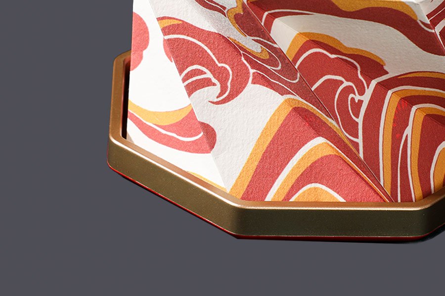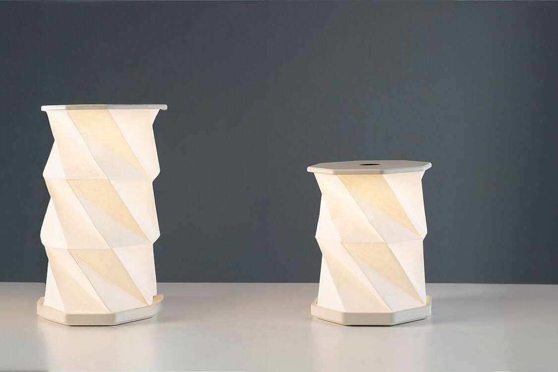 Von Hand gefaltetes Spezialpapier mit charakteristischer Struktur. Bedruckbar mit Logos, Farben oder reduzierten Grafiken. Extrem leicht und zugleich formstabil.